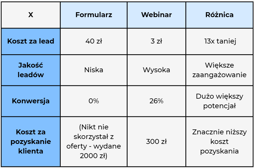 W jednym z wdrożeń, po zmianie klasycznego formularza na model webinarowy, przy budżecie ok. 300 zł kancelaria pozyskała klienta.